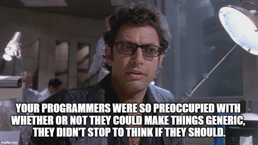 So we have now replaced three types with a single generic type, and avoided some duplication. Surely this is a good idea, yes? Here’s Ian Malcolm’s take: