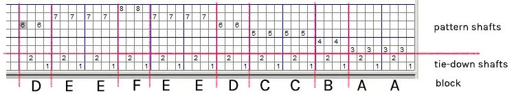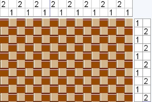 The grid above the design (the “threading”) indicates how the warp threads are grouped. The grid is read right-to-left, so the first vertical warp thread (on the far right) is in group 1. The second thread is in group 2, the 3rd thread is in group 1 again. And so on. These groups are called “shafts”. On a physical loom all the threads in the same group really are tied together onto a single shaft which is then lifted up when required.