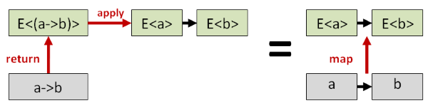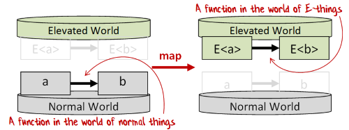 An alternative interpretation of map is that it is a two parameter function that takes an elevated value (E<a>) and a normal function (a->b),