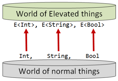 So, for example, we have the set of values called Int in the normal world, and in the elevated world there is a parallel set of values called, say, E<Int>.