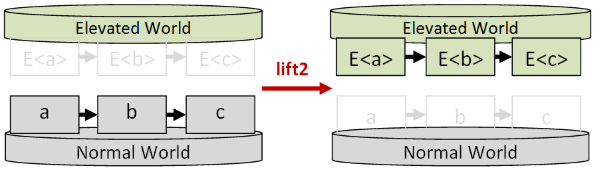 The concept of moving something from the normal world to the elevated world is called “lifting” (which is why I used the term “elevated world” in the first place).