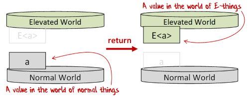 does not return something in the normal world, but a value in another, different, enhanced world? We’ll see how to address this challenge in a later post.return functionCommon Names: return, pure, unit, yield, point